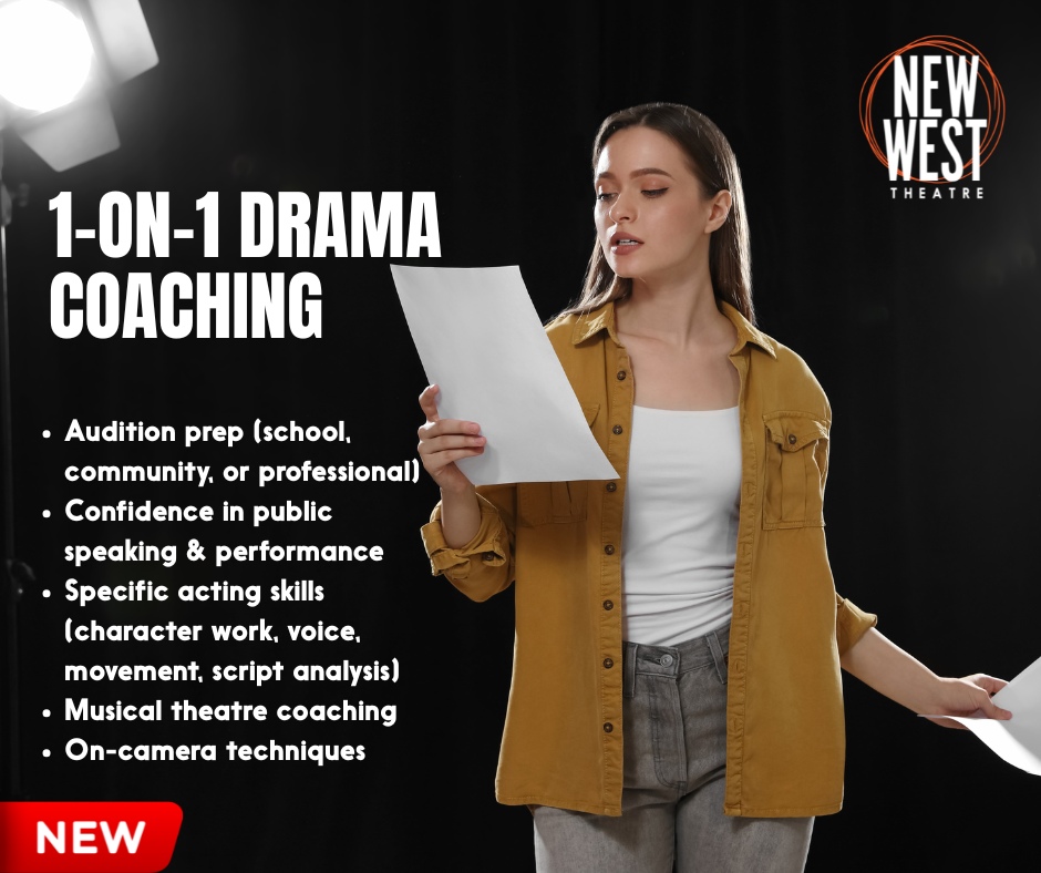 *NEW THIS YEAR! New West Theatre is excited to offer personalized 1-on-1 drama coaching for students of all ages and experience levels! Whether you’re brand new to theatre, have some school or community stage experience, or are an experienced performer looking to sharpen your skills, our private sessions are designed just for you. Together, we’ll focus on exactly what you need—whether it’s audition prep, building confidence in performance and public speaking, strengthening acting techniques, or exploring musical theatre and on-camera work. Sessions are flexible and scheduled around your availability, and at just $25 per hour, you choose how many classes you’d like to take. No matter where you’re starting from, our instructors will meet you at your level and help you grow as a performer in a supportive, one-on-one environment.