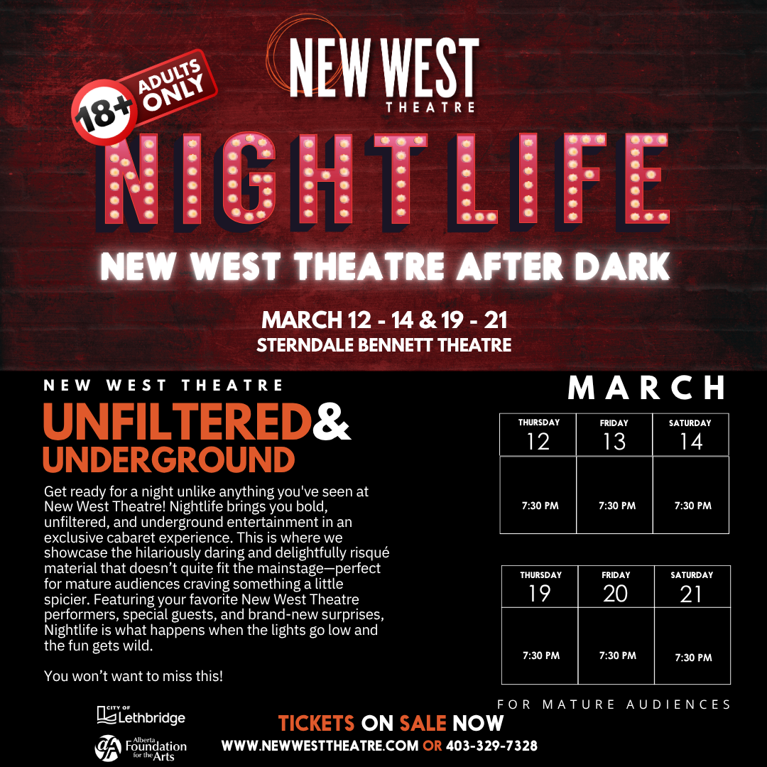 Get ready for a night unlike anything you’ve seen at New West Theatre! Nightlife brings you bold, unfiltered, and underground entertainment in an exclusive cabaret experience. This is where we showcase the hilariously daring and delightfully risqué material that doesn’t quite fit the mainstage-perfect for mature audiences craving something a little spicier. Featuring your favorite New West Theatre performers, special guests, and brand-new surprises, Nightlife is what happens when the lights go low and the fun gets wild.