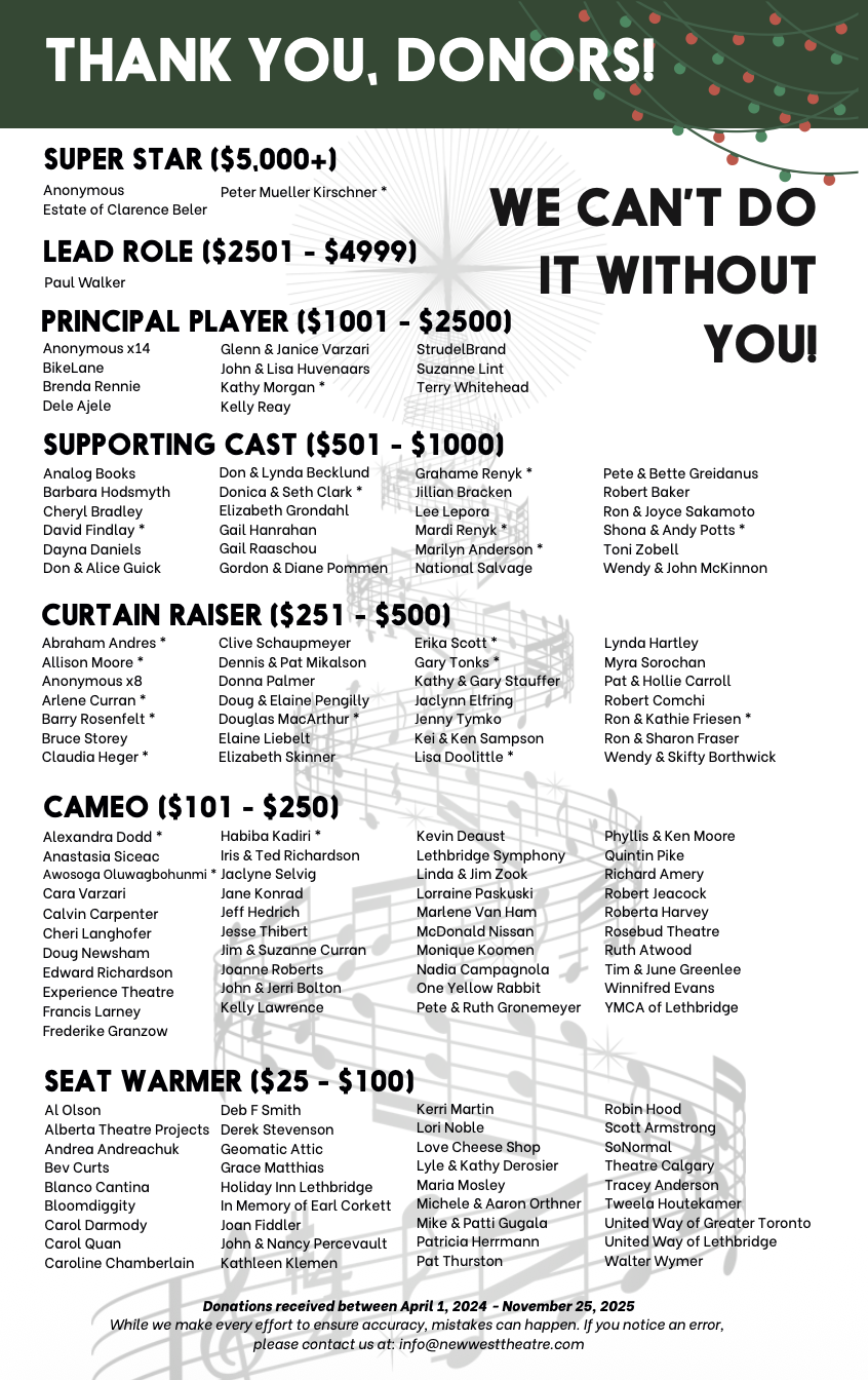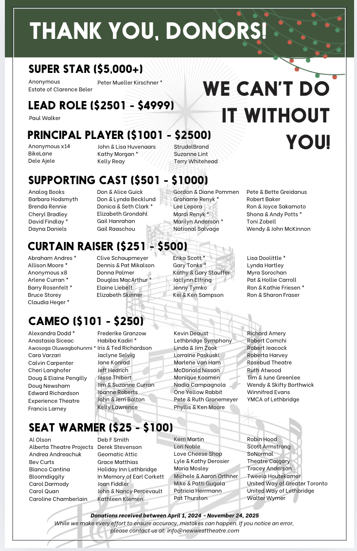 donors & sponsors We applaud you! See our Sponsorship PackageDonate now our donors We applaud you! Our 2025 - 2026 Sponsors government and foundations Affiliations Address 1002 – 4 Ave South Lethbridge, AB (403) 381-9378 Contact Us Upcoming Events Follow FollowFollowFollow Subscribe Success! Email Subscribe
